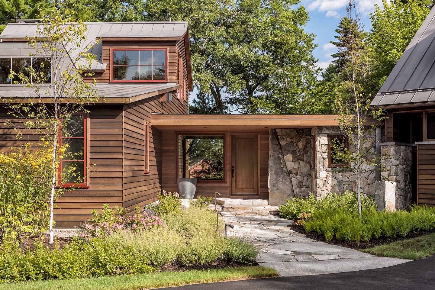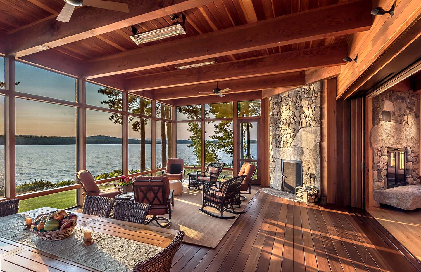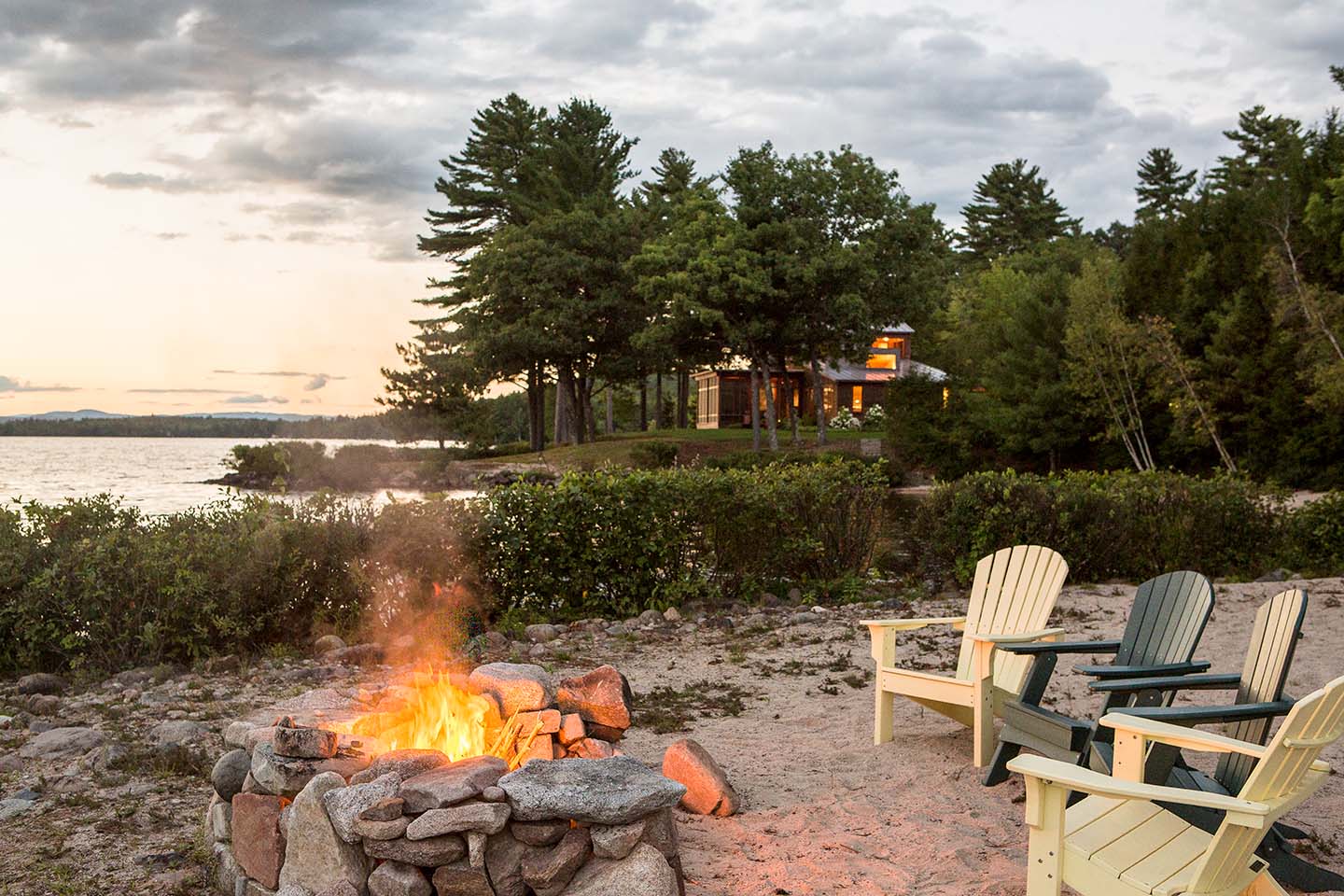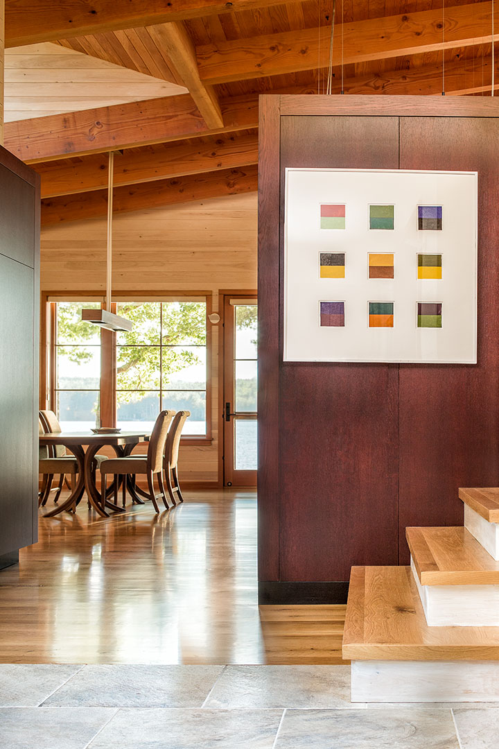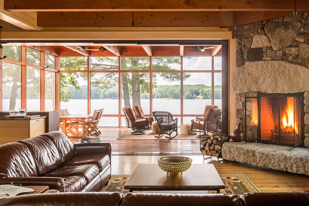 Benefiting from the existence of a dilapidated structure, we were able to reuse and expand the footprint and volume with a new contemporary version of a Maine camp. Using sun orientation, views, and prevailing winds as guides the plan began to take shape. We grew the volume to meet program needs while getting sunlight deep into the space at all times of the day. An exterior comprised of red cedar, live edge Maine granite and metal roofing were chosen to balance a modern language with the comfort of familiar materials. The combination of interior wood walls and expressed heavy timbers provide warmth to the large open spaces. When fully open, a 28 foot lift-and-slide door merges the main living space and kitchen to the screen porch, providing a true sense of outdoor living. A studio space seconds as additional guest quarters along with two other cabins making this property a family treasure for generations to come.