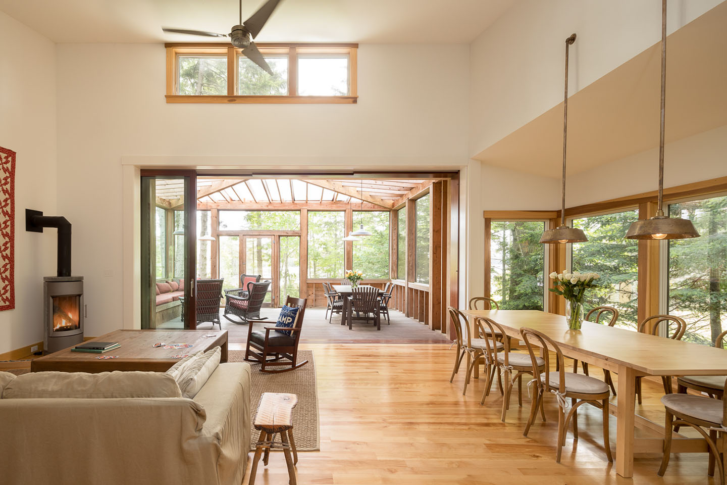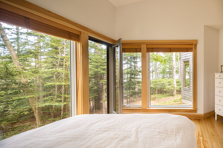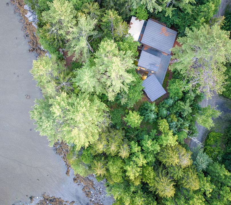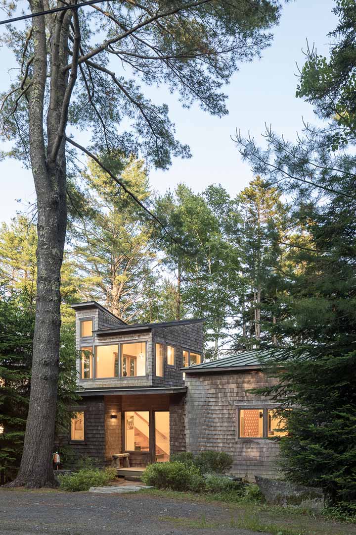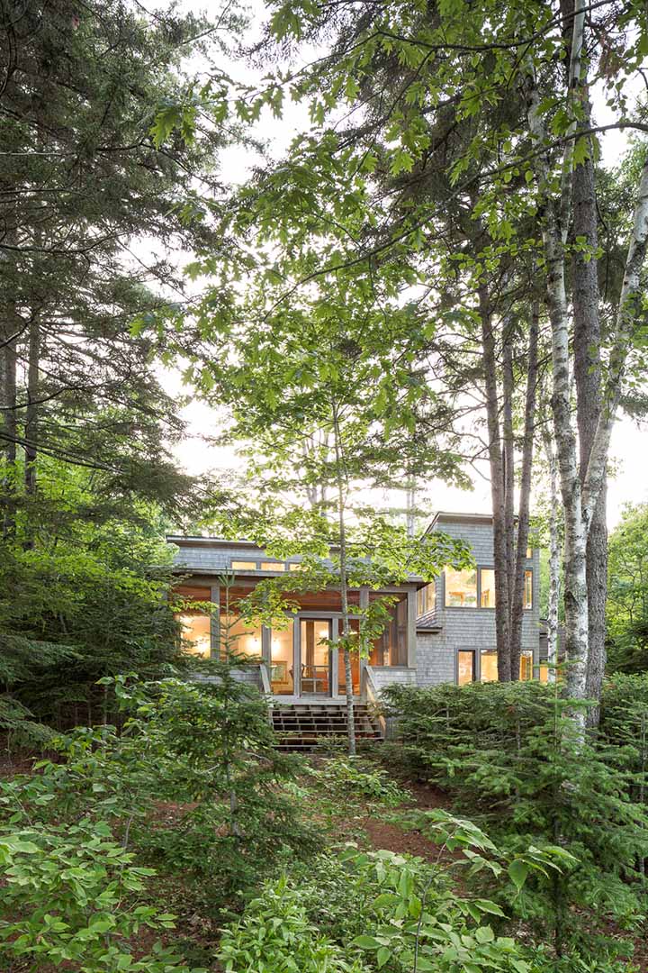 This peaceful retreat has welcomed many since originally built. In addition to providing a gathering place for close friends and family, the owners have opened their doors to community members, artists and others seeking a space to find peace, reflection and inspiration. This coastal Maine site is at the tip of a quiet cove nestled behind several islands just off shore. Intentionally leaving the landscape in its natural state with minimal impact gives an immediate sense of belonging and integration with nature. The central core is the entry with the “nest” above. The main living space and the bedrooms flank either side of the core. The nest provides a sweeping view of the ocean and the natural landscape with dappled light filtering through the canopy. This truly is a place to feel grounded and connected to the landscape.