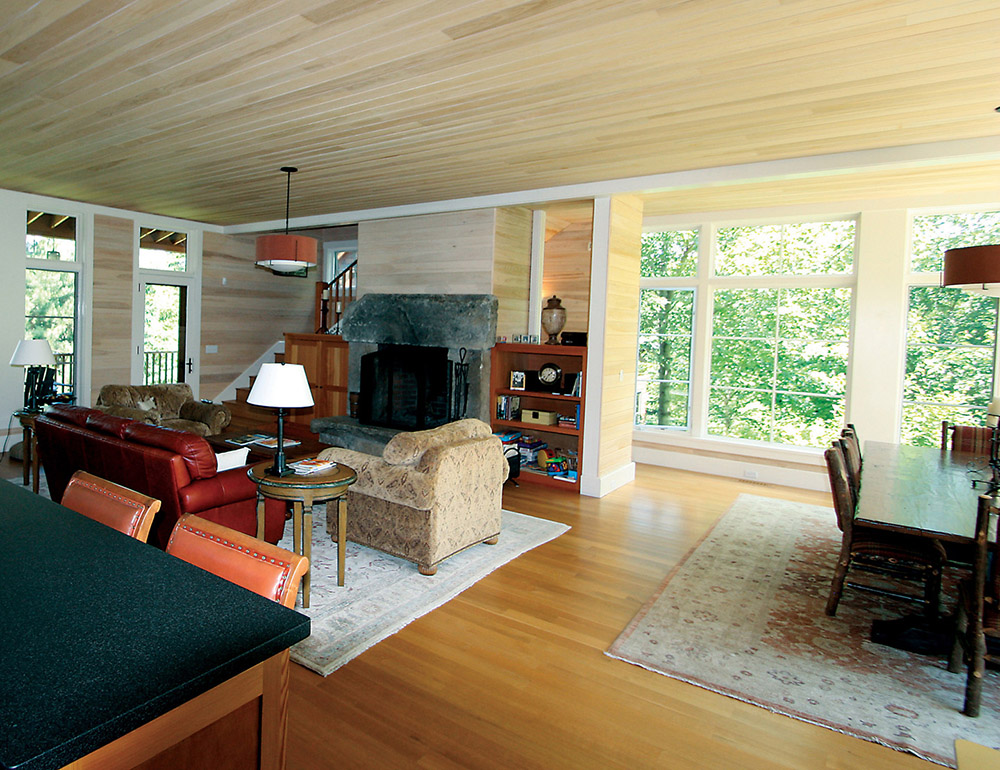 This stand-alone guesthouse completes a family retreat on the coast of Maine. While giving guests a get-a-way spot from larger gatherings, one can easily transition to the excitement of family events through a trail system along the shore. The exterior is clad in red cedar shingles with a clear finish, and painted accents use natural hues matching specific colors found on the site. The combination of wood and stone interior gives warmth to large spaces. Bedrooms are arranged to allow multiple families to stay together yet maintain privacy.